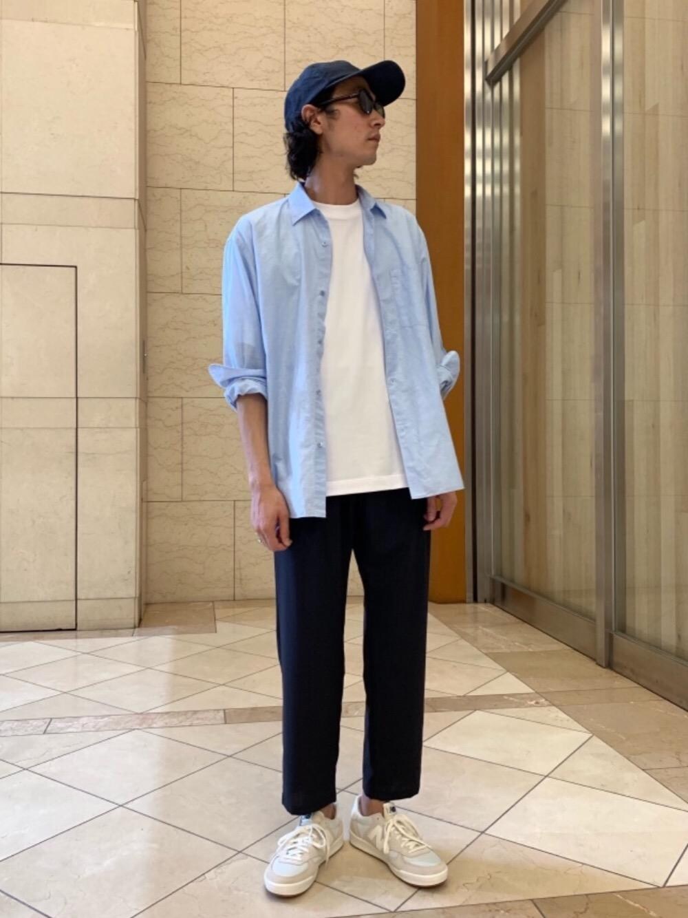 【身長】173cm 【年代 】20代後半 【普段のサイズ】〈トップス〉44/S 〈ボトムス〉42/S シューズ〈26cm/6h〉 【着心地・サイズ感】 シャツ→軽い着心地、ベーシックなサイズ感 Tシャツ→とろみのある柔らかい着心地、ややゆったり目 パンツ→さらっとした着心地、ベーシックなサイズ感 【コーディネートポイント】 爽やかな印象になるように、ライトブルーのシャツを選びました。暑苦しくなく、袖でこなれ感を演出できます。