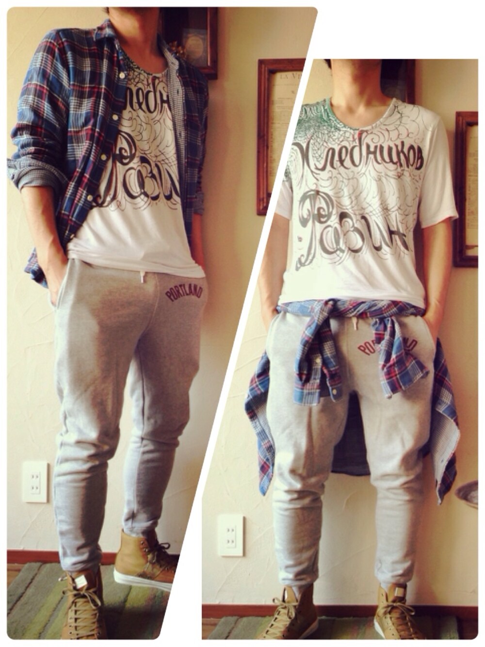 シャツ : GROBAL WORK Tシャツ : Johnbull スウェットパンツ : RAGEBLUE シューズ : convene/Jack Pursell