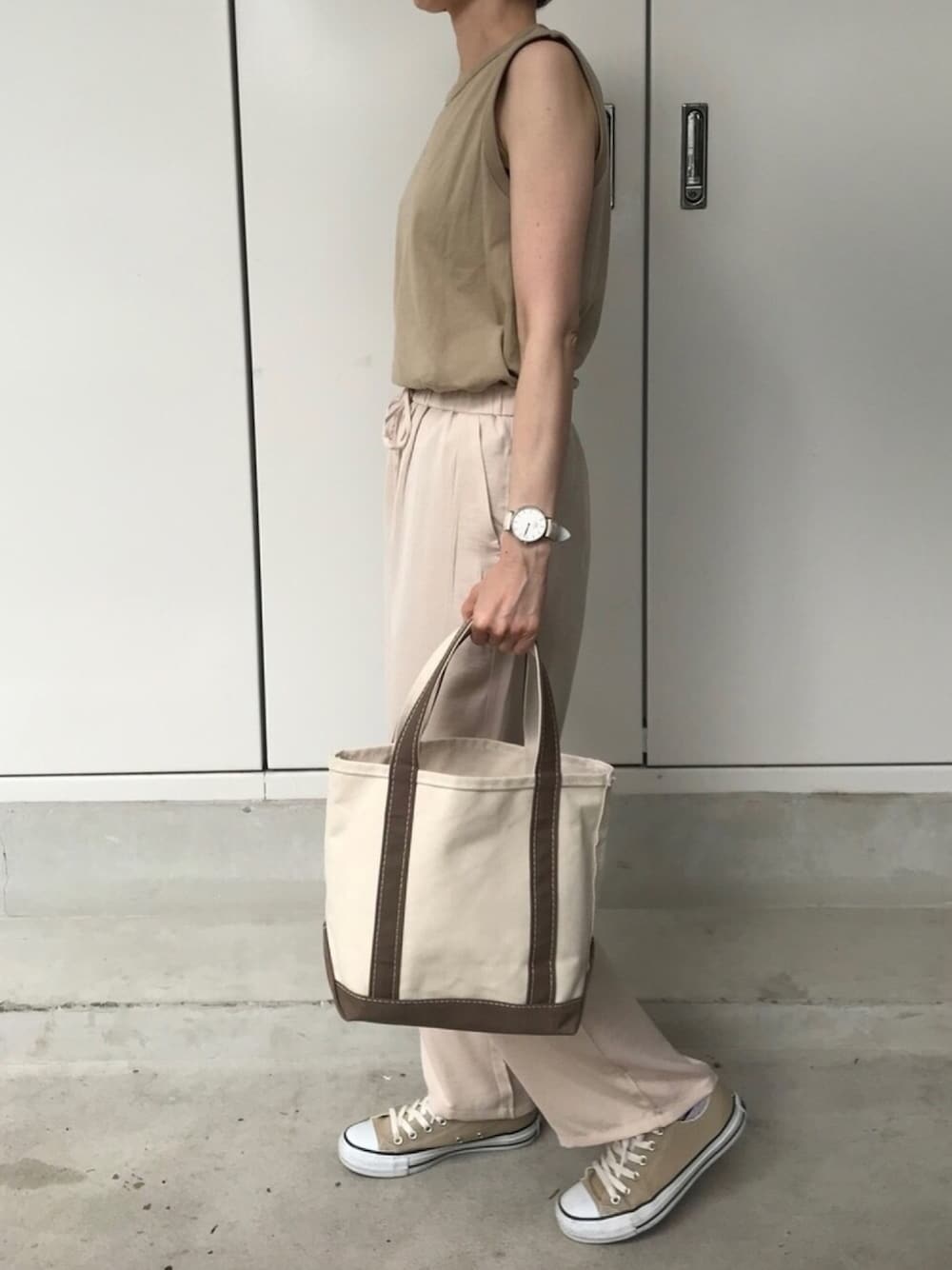 ベージュのワントーンコーデ。 ヘインズのノースリーブT、 しっかりとした作りで、他の色も集めたくなりますね。 ジーユー のパンツ、 サテンのような生地で、お安いのに高見え。 イロチ買いしました!