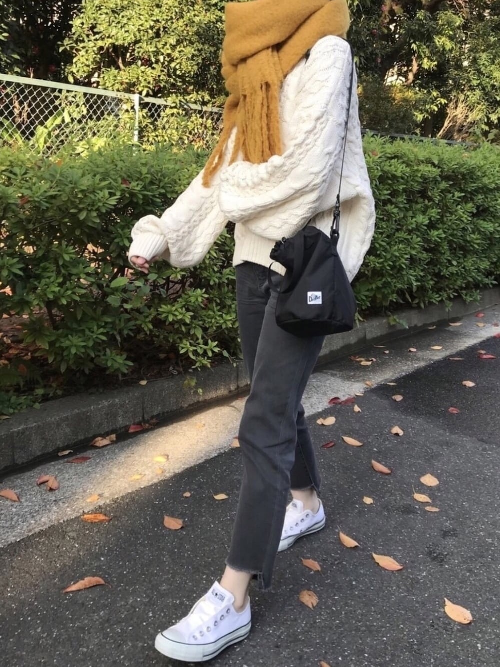 ニットはコットン混なので チクチクせず、袖がホントに可愛い😍 デニムは切りっぱなしで 前後の長さが違うところがお気に入り。 モノトーンに マスタードのストールで差し色に。