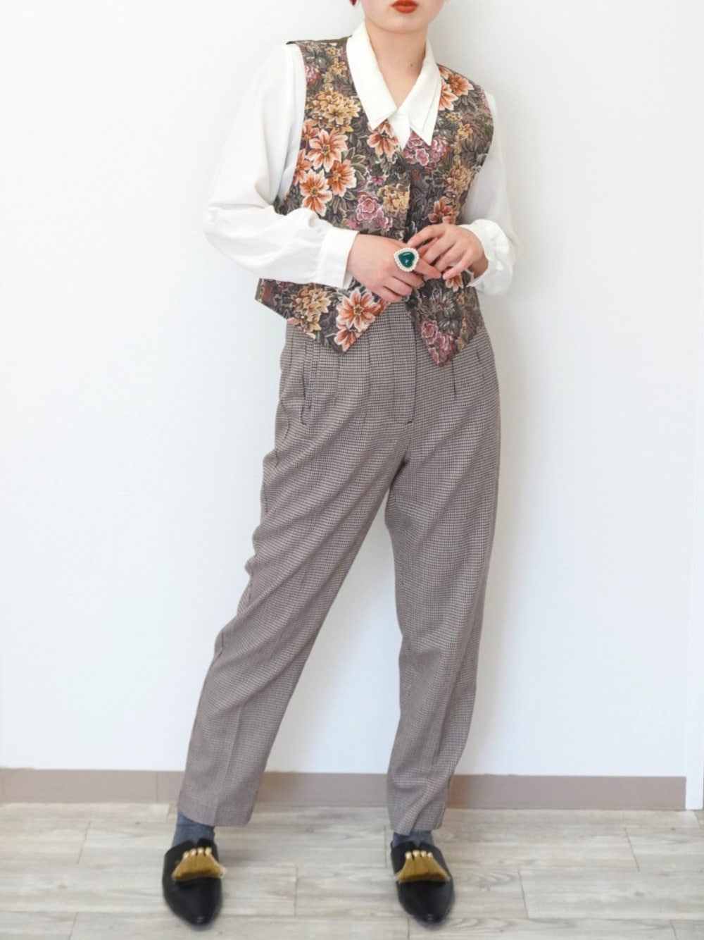 pants : ZARA ベスト : USED ブラウス : USED シューズ : PAGEBOY ブラウス × ベストの古着コーデ シンプルなブラウスに花柄のベストが よく合う⸜🌷︎⸝⸜🌷︎⸝⸜🌷︎⸝ ベストで腰周りが浮く分、 キュッとしたシルエットのズボンで スタイル良く。