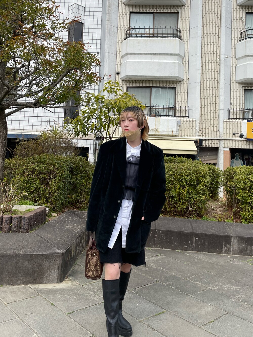 jacket: USED shirt: UNIQLO +J bustier: Ray BEAMS pants: JEANASIS boots: JEANASIS モノトーンーーーー ジャケットのベロア生地と ビスチェの透けてる生地と パンツのデニム生地と ブーツのレザー生地 黒異素材MIXーーーー