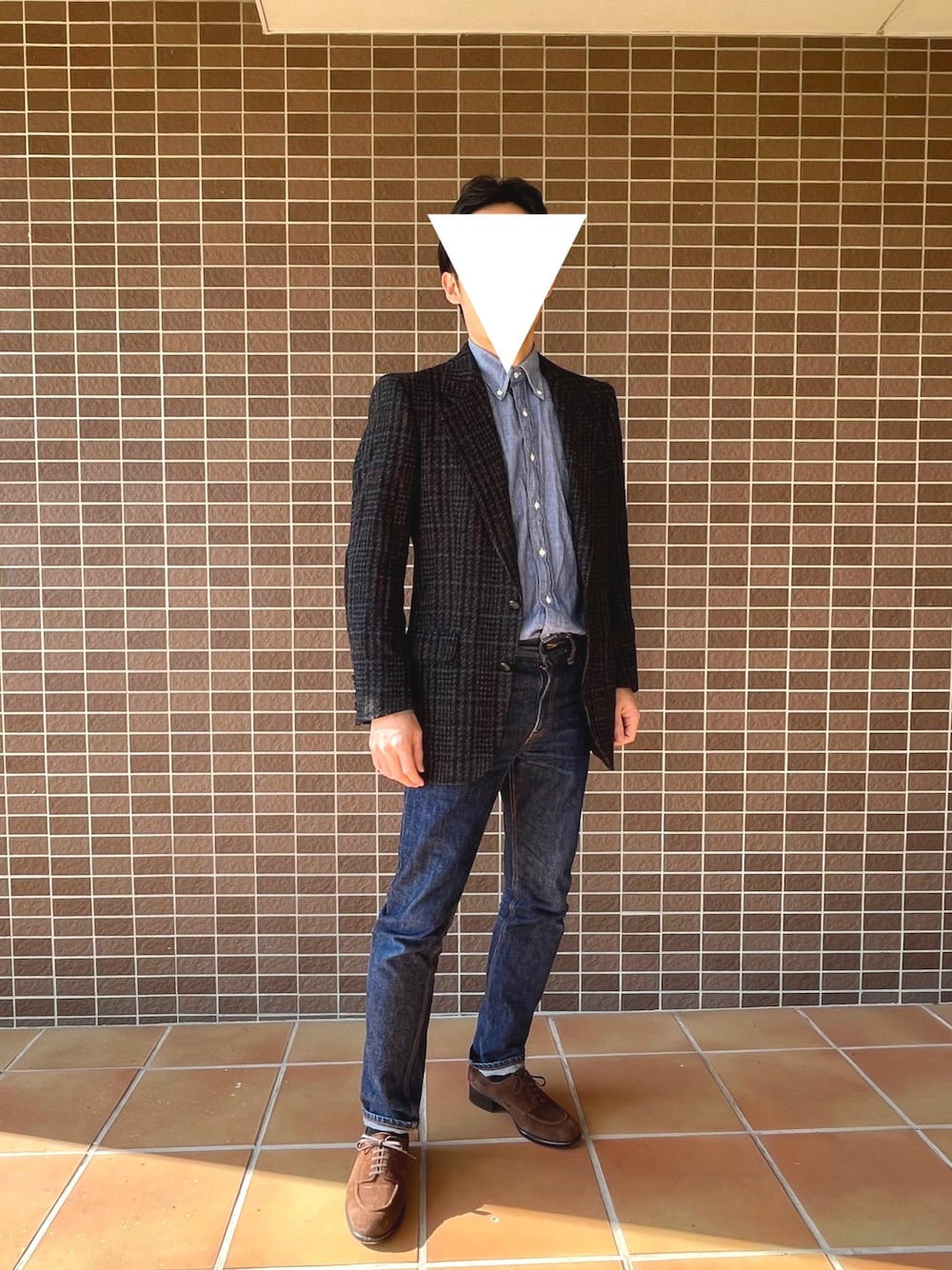 古着のツイードジャケットにデニムシャツ、足元はブラウンのドレスシューズという王道のコーディネート。 ツイードジャケットは老けた印象が出るため、デニム等の若者っぽいアイテムと合わせることが、上手くまとまったコツ💡