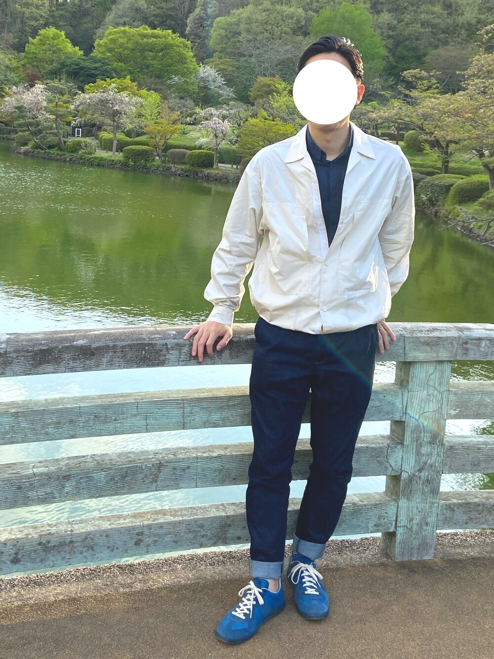 21SSのユニクロ+Jのシャツアウターを用いてコーディネートを組んでみました。 シャツアウター以外はブルー系で統一し、デニムはロールアップすることで、春っぽさを出しています。 革靴の方が大人っぽく見えるでしょうが、歩く距離が長いことがわかっていたのでスニーカーに。