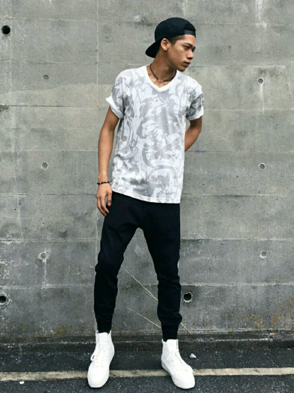 coordinate point. ストリートmixスタイル 総柄半袖Tがインパクト抜群! ブラックパンツと合わせて足元はハイカット +キャップでストリート風に。