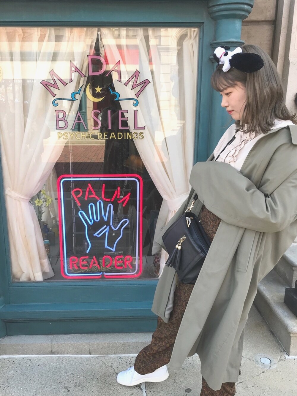 祖父からもらった大きめシルエットのコートを襟ぬきで羽織りました^^ シューズとバック以外全て古着です。