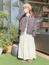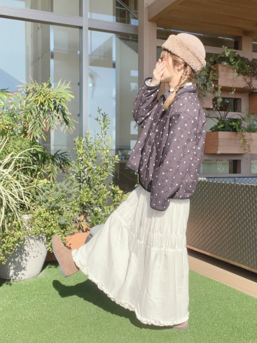 も な こ です。 キルティングのアウターは お花の刺繍でとてもキュート。 軽くて着心地◎でした! フリルのスカートと合わせて ガーリーにしてみましたꕤ︎︎·͜· 春らしくてウキウキ🐒ですね。