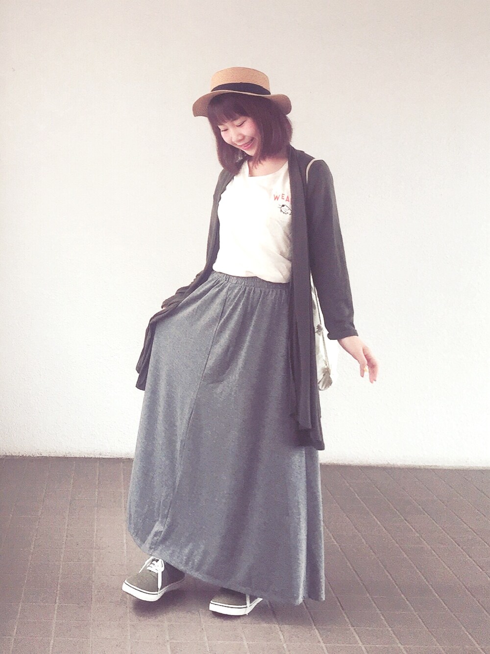 久々の投稿です~~~ 本日またしても雨ですが 張り切ってまいりましょ~ 大人カジュアルなコーデです( ˆoˆ )/ 深めのカーキ色とグレーのスカートで 大人感を出したよ(v_v*)←