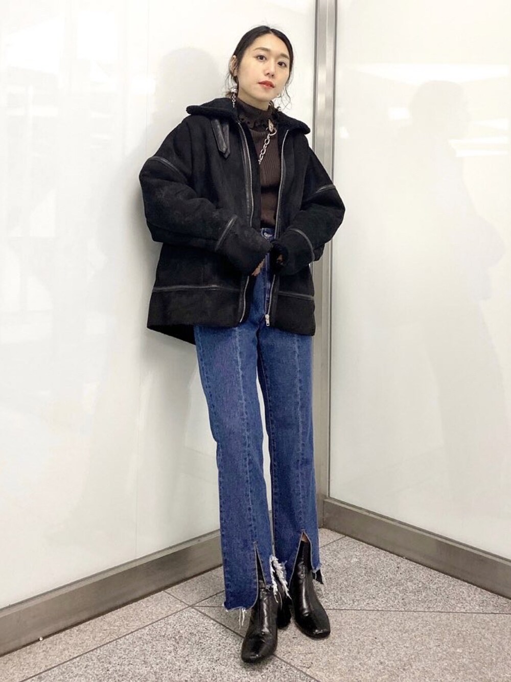 ブラックのムートンジャケットはグールに着こなしたい。 カジュアルになりすぎないブラックはデニムとも相性ばっちり〜👌