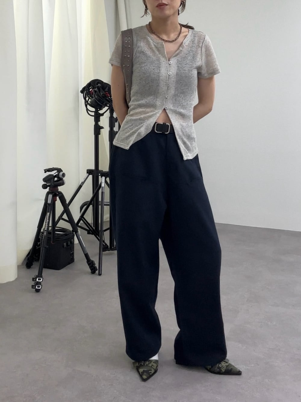 大人気のシアーナローカーディガンの夏ver。 ボディラインの綺麗なシルエットとシアーな素材、そしてなんと言ってもおへそ周りの逆Vの開きがポイント。 そしてスウェットパンツと同型のスラックスも超おすすめ。こちらはカミングスーンです! HiNTミュールパンプスの新色はカモ柄。 今年のスタイルの差しにベストな柄です♡