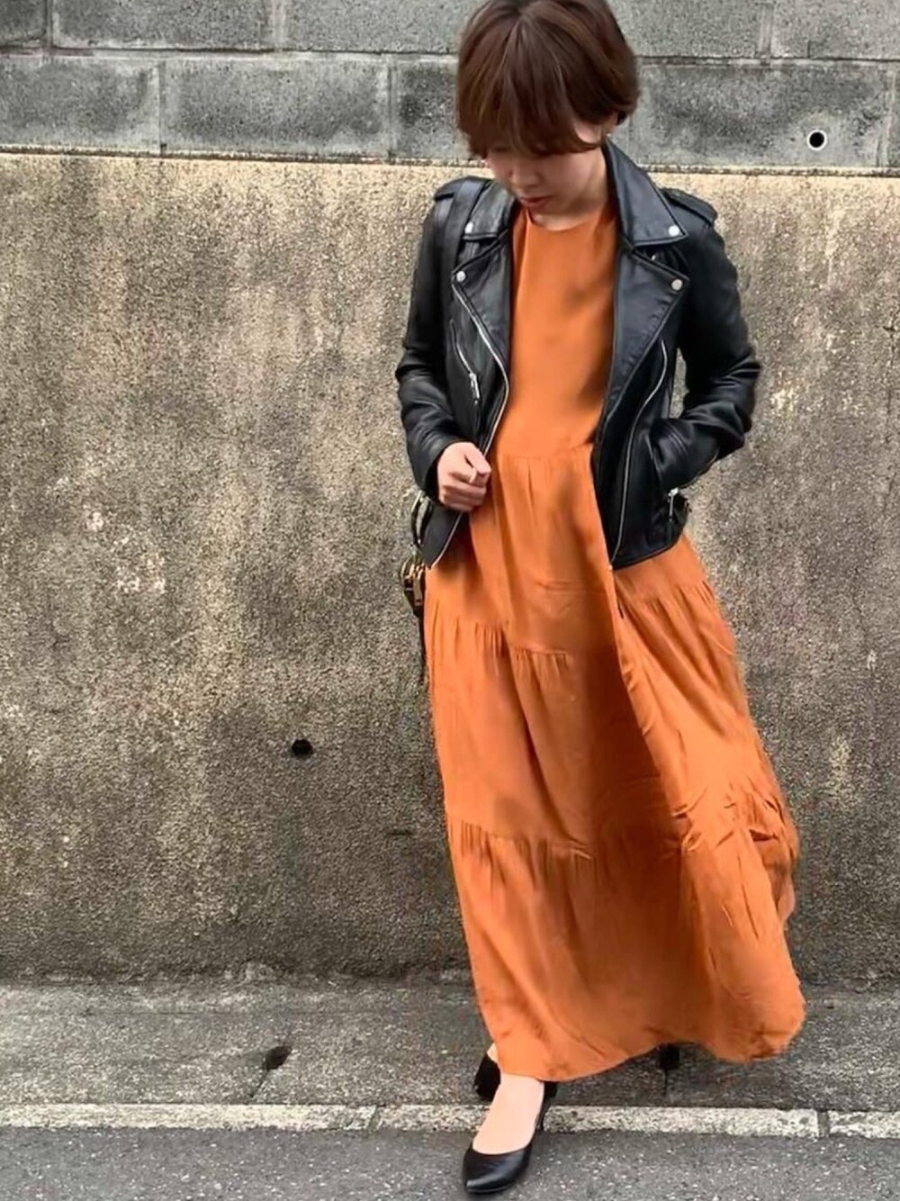 Aラインの5分丈袖ワンピを ライダースの黒で締めました🧡🖤 1枚でサンダルと合わせればリゾートカジュアルにも着れるしワンピは便利✨