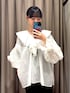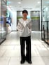 ご覧いただきありがとうございます。 フリルがとってもかわいい、コットンボイルラッフルブラウスを着用しました。 パンツとシューズは黒で統一し、コーディネート全体が甘くなりすぎないようにしています。