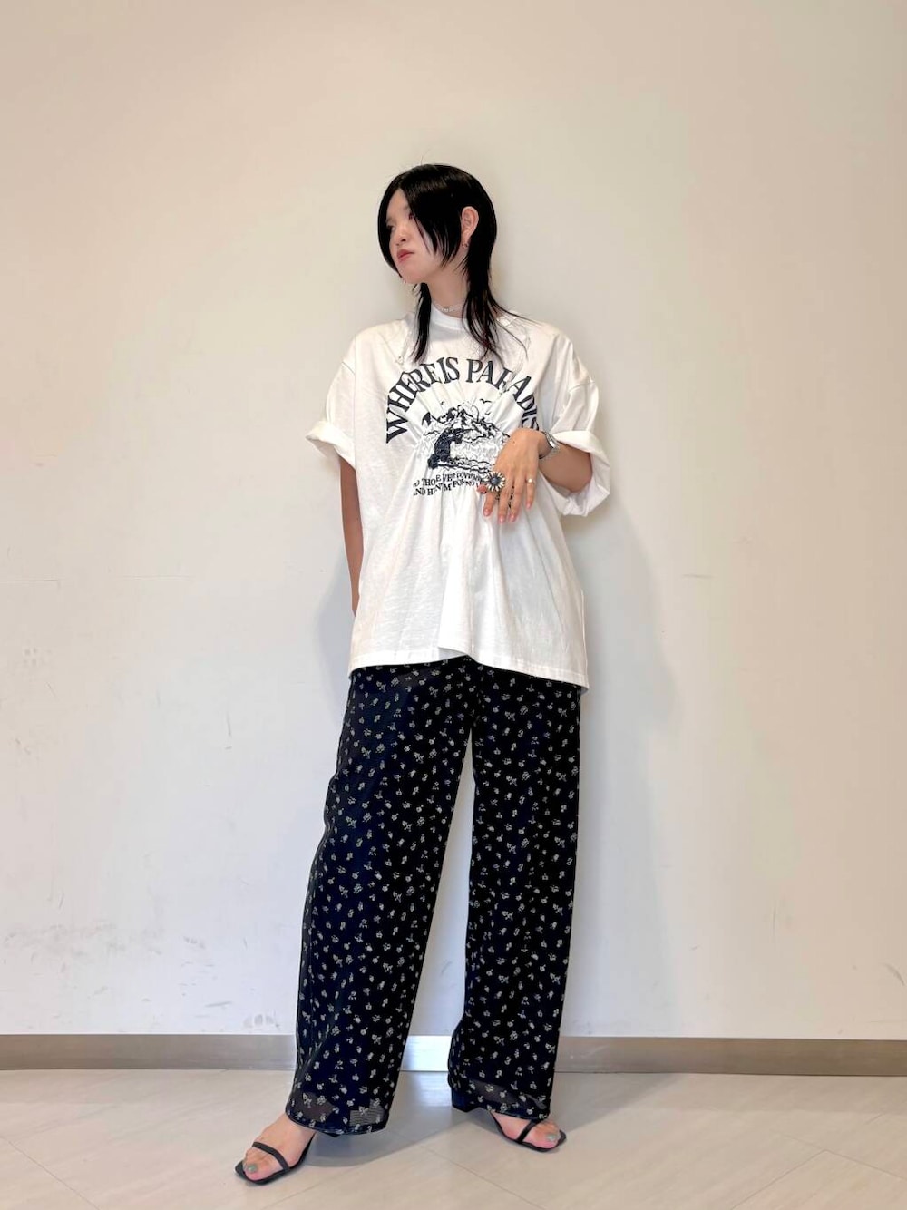 ゆるっとらくかわいいコーデです🤍 ビッグシルエットのTシャツは、ウエストの所でキュッとメリハリあるシルエットにしてくれるので、女性らしい着こなしができます! メッシュパンツはスポーティな素材感と落ち着いたカラーなので、甘々しすぎないアイテムです!