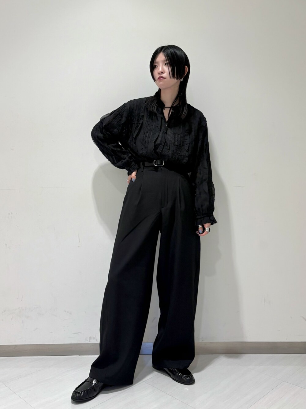 フリルたっぷりのブラウスでも、ブラックなら甘すぎないので取り入れやすいですね! スラックスが腰周りのシルエットを拾わずスッキリ着こなせる上に、丈長めなので高身長さんにとーってもおすすめです!!