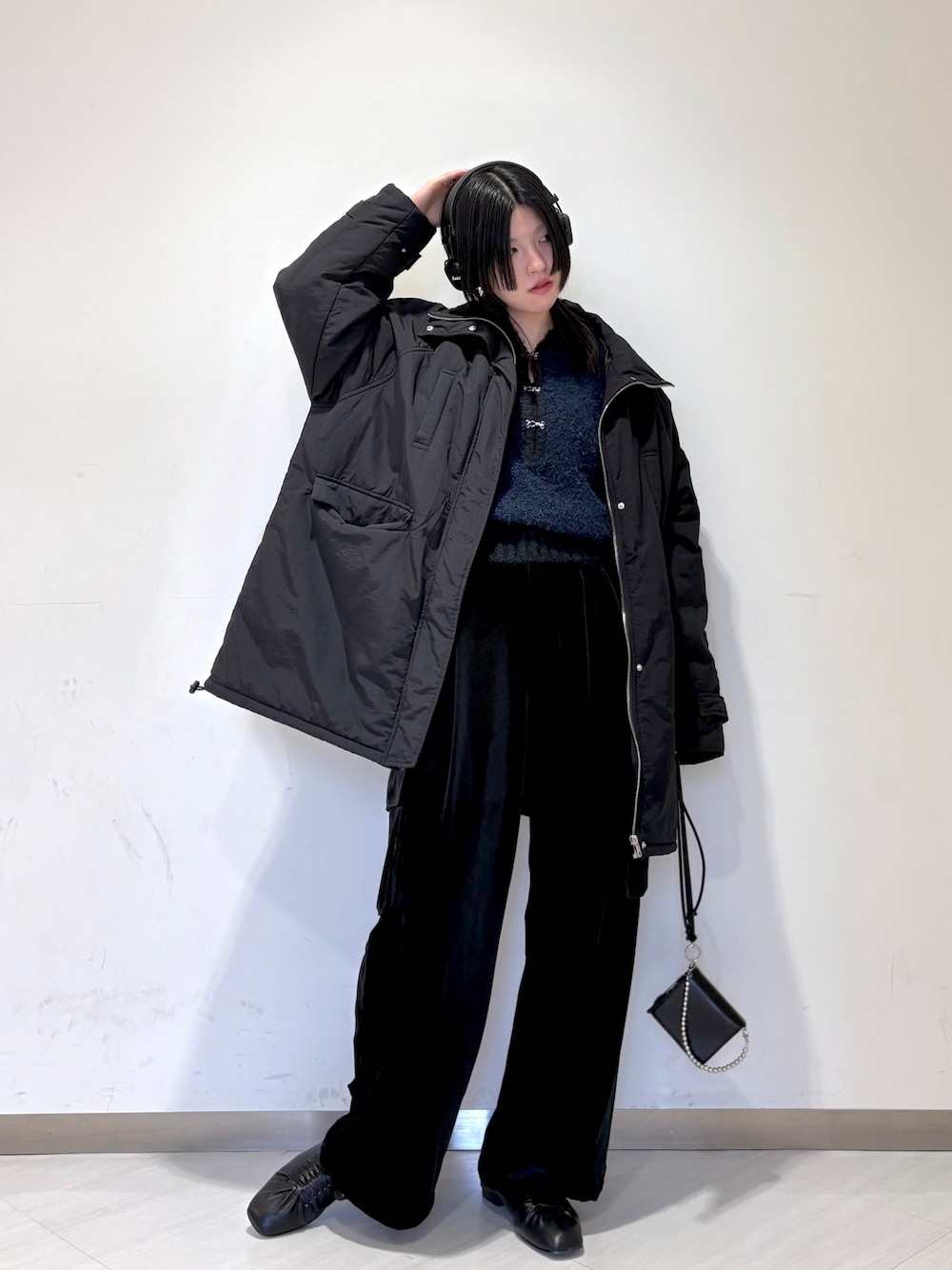 軽くてあったかいアウターは、セールでお買い求めやすくなっているので、買い替えにも買い足しにもオススメです! ホックが目をひくニットと、ベロアのカーゴパンツでハンサムスタイルにしました。