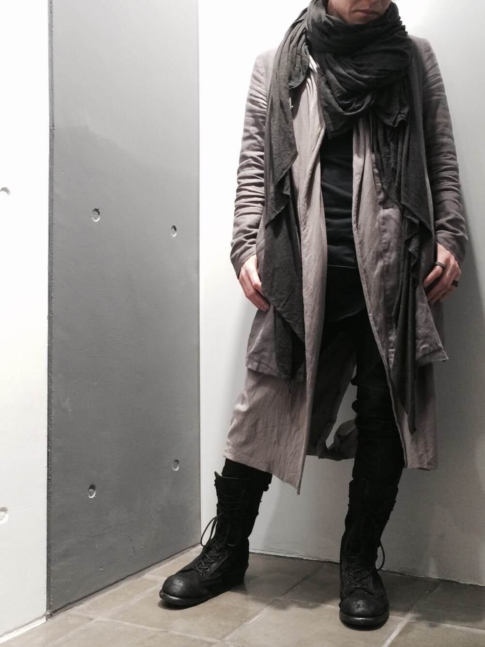 私服です。 好きなカラーの グレーとブラックのコンビ コートとロングカーディガンのレイヤードスタイルです。 やはり今日もダークファッション