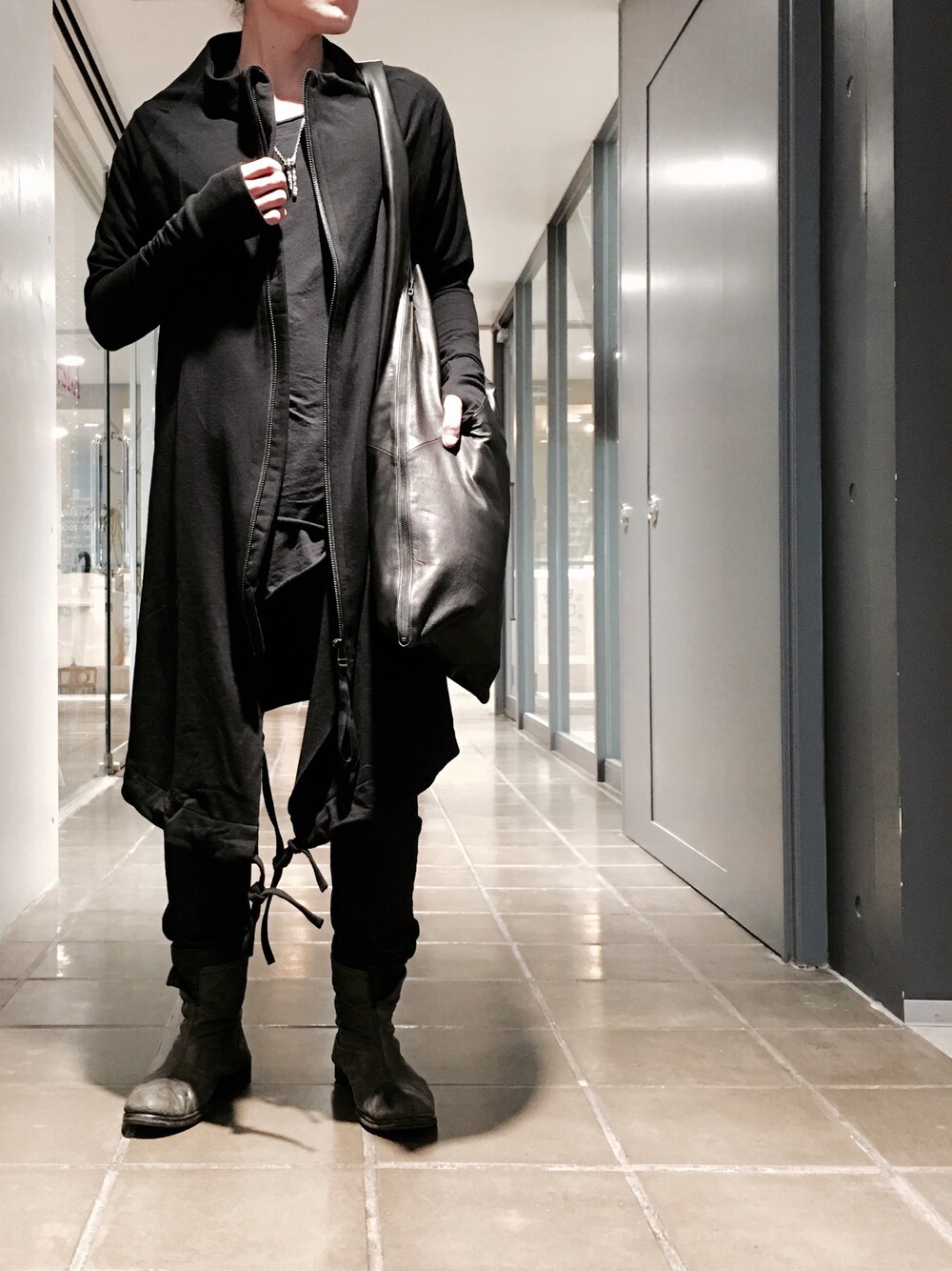 16ssから取り扱いを開始した デンマーク発のアルチザンブランド 【leonlouis】でコーディネートしたロングレイヤードスタイル long cardigan&F2 pants →leonlouis toto bag → T.A.S t-shirt →thom krom