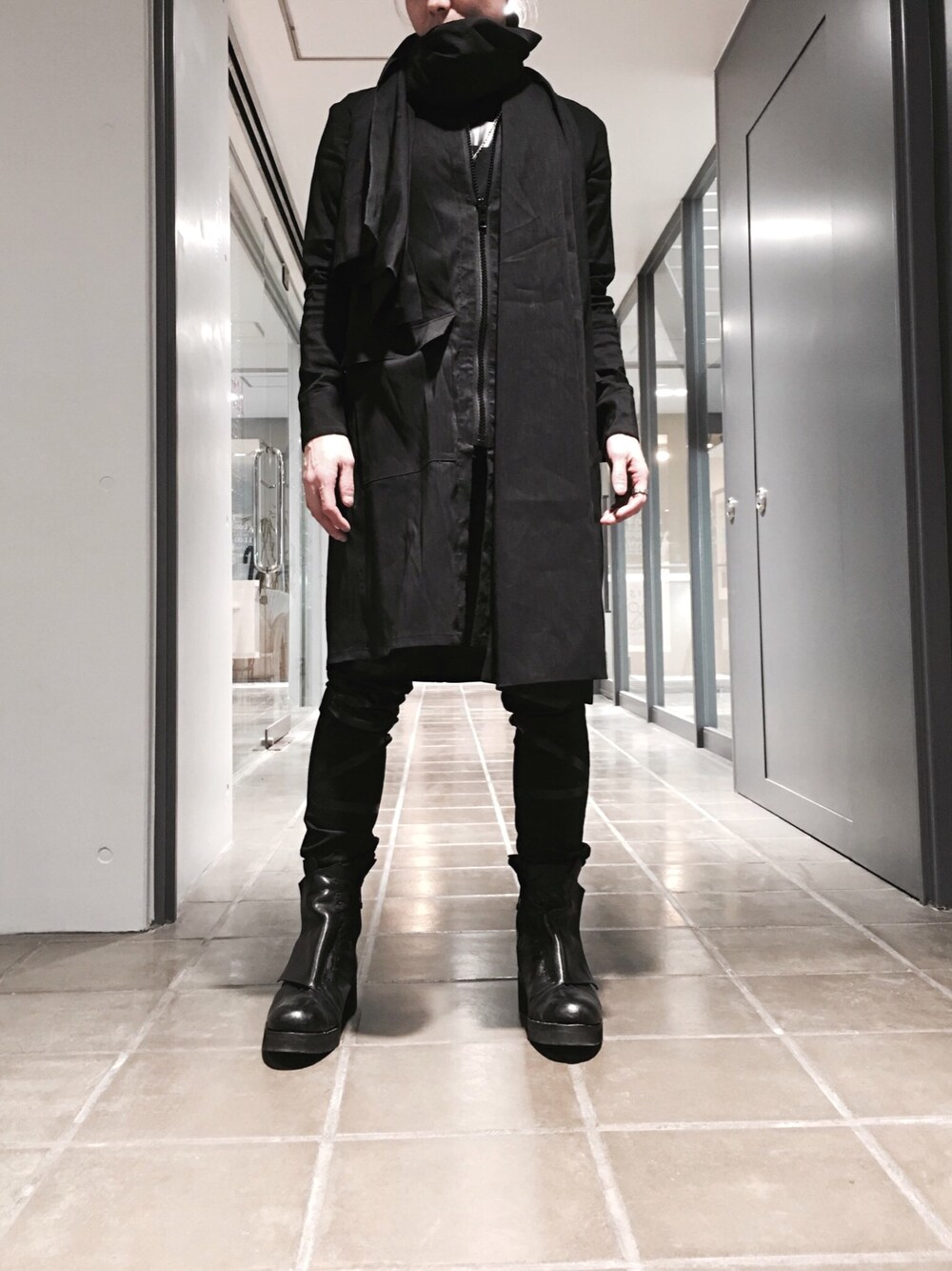 福岡発のデザイナーが手掛ける 【Noir Fr】 ストール付きスプリングコート ラバーラインスキニーパンツ オールハンドメイドで作られたアルチザンブーツブランド【portaille】のカバードブーツ 新作でのオールブラックコーデです