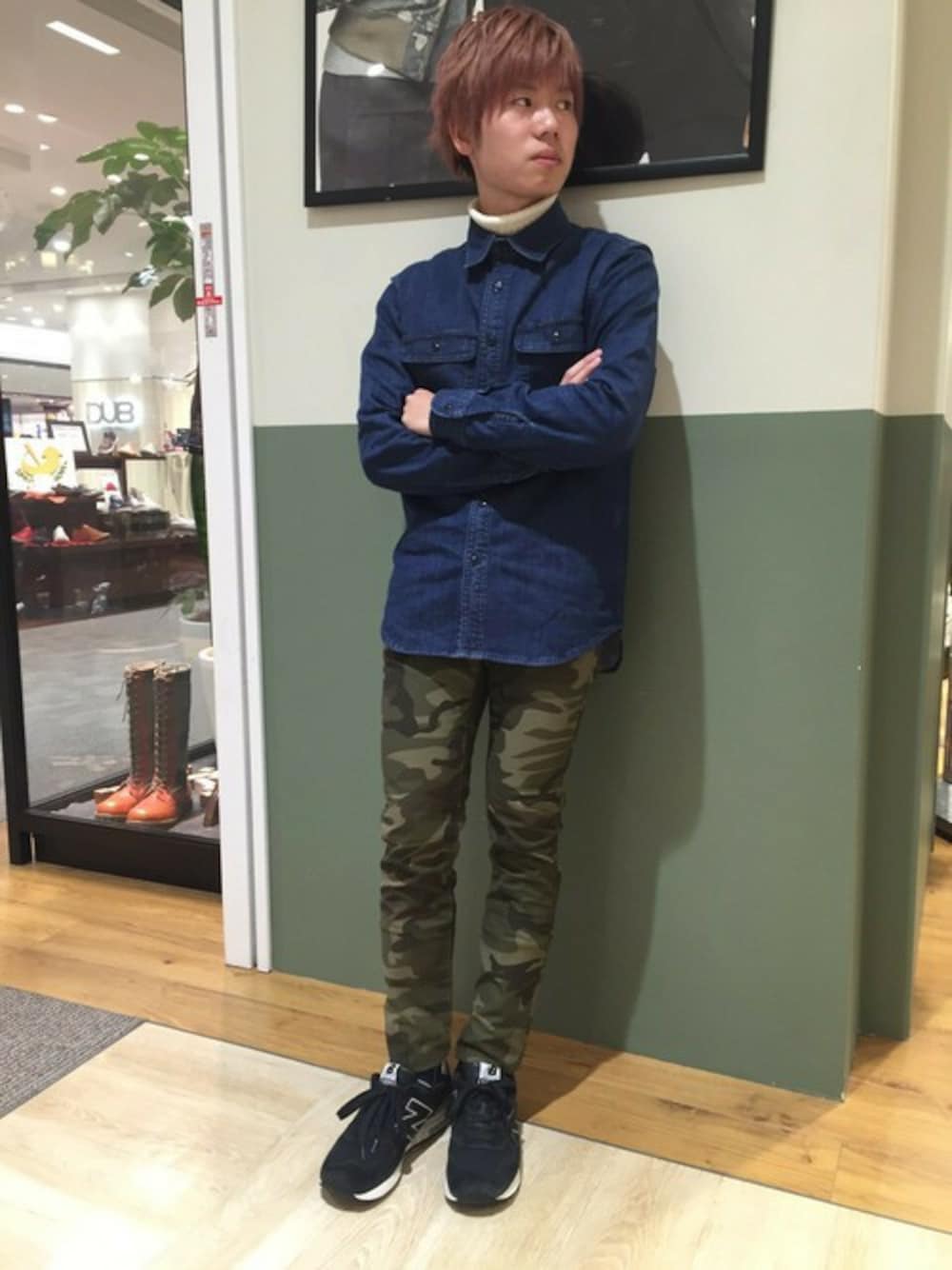デニムシャツに迷彩スキニーを合わせて、よりカジュアルに! しかもデニムシャツの下はタートルネックでちょっとしたアクセント😙 迷彩も生きるしデニムシャツも生きる好きなコーデです!😆