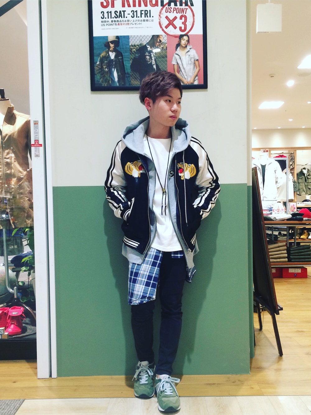 こんちーわ〜 今回はスカジャンの着回しコーデでーす🍣 腰巻きの青チェックが中々ええ仕事してくれてまーすぅ🍣 このパーカーも重ね着せんでもええ感じのデザインなんで↓で見て見てくださーい😙 アウター sizeM パーカー sizeM