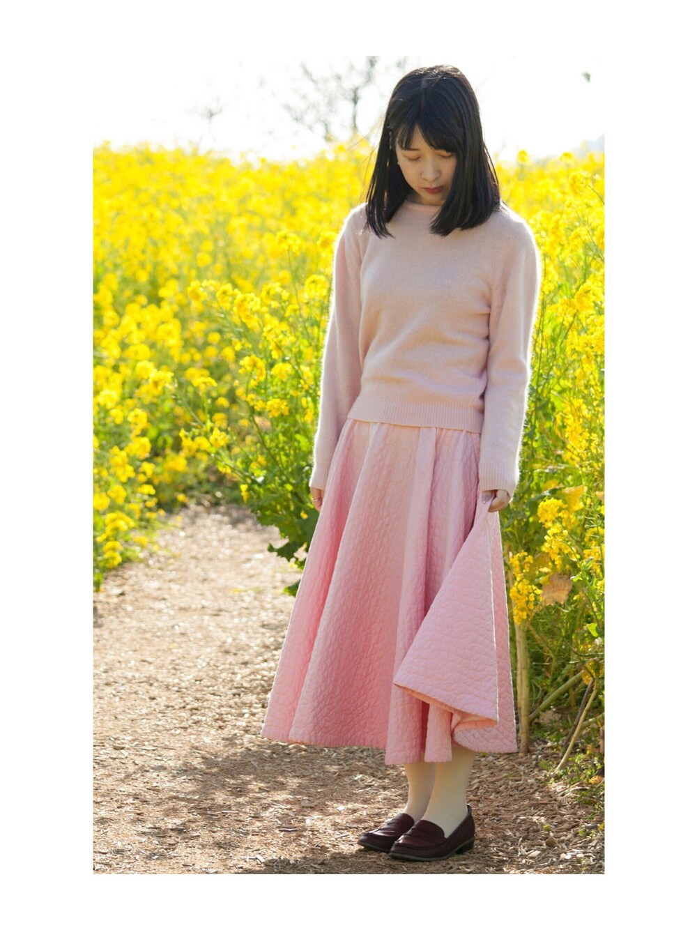ニット: Santa Monica スカート: バージンメリー ▼ 古着コーデです。 春だから、ピンク! 菜の花畑にて( *´ω`*) 今日で3月が終わりですね、、