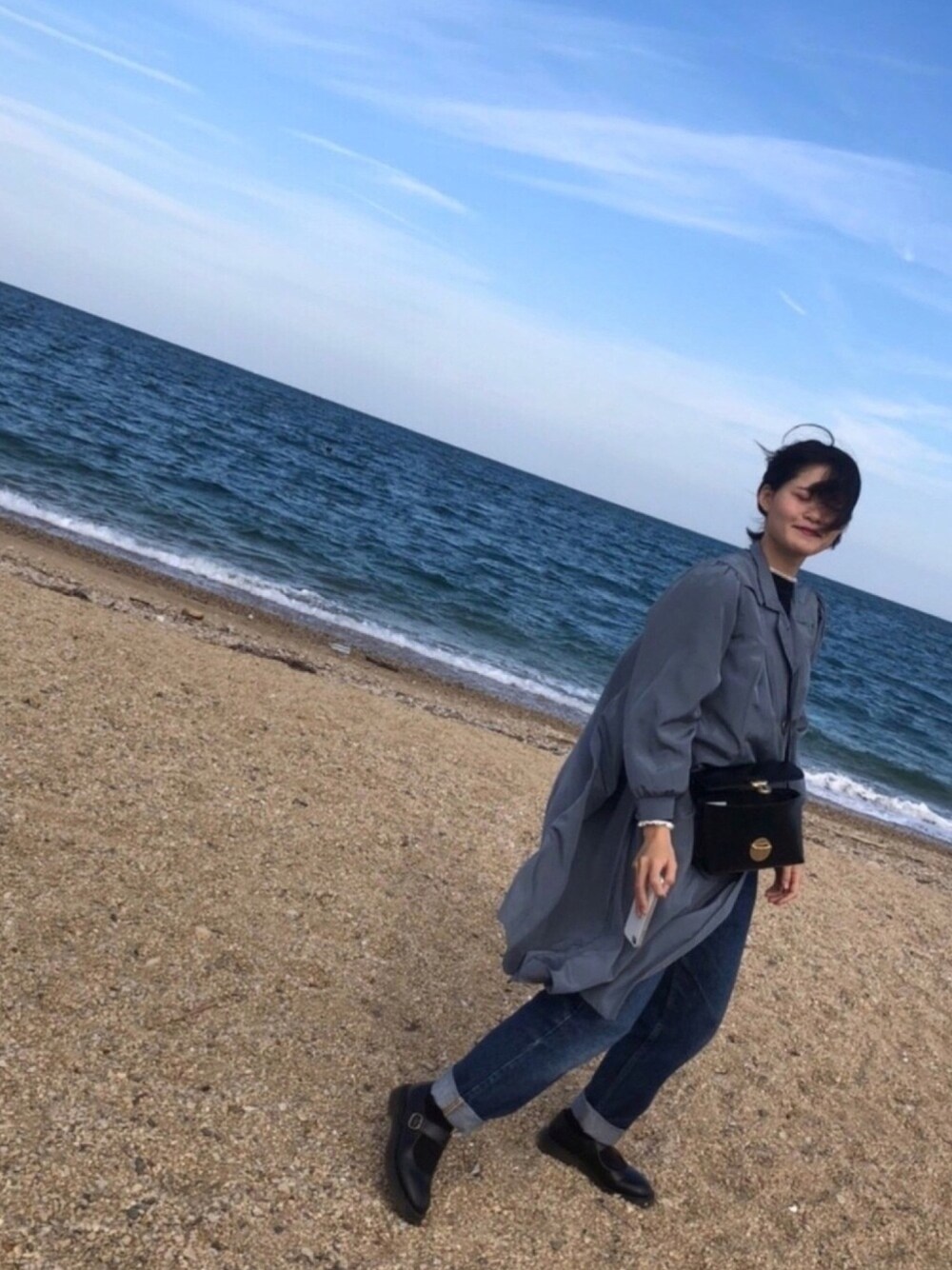 ・ 久々の海🏖 暴風でした〜💨💨💨 ・ ・ ・ このトップス、首元と手首に白いフリフリがついててかわいいの! 白い靴下にすべきだったな、ザンネーン🤧🤧🤧 ・ ・ コート 300円 ジーンズ 300円 トップス 2000円くらい バッグ 2500円くらい