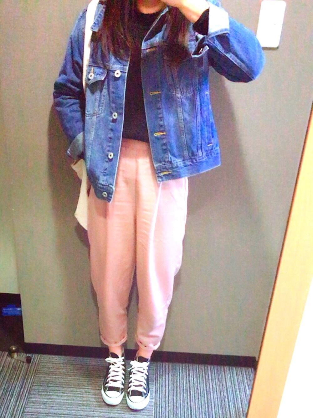 今日は、遠出してます(^o^) 昼間は晴れでポカポカしてたのに、夜はまだ寒かったです…… 春らしくピンクのテーパードパンツで綺麗目コーデ!Gジャンと合わすと映えて綺麗! 黒のテーパードパンツも買ったから、それも後々あげたいと思います(^o^) このニットは、セールで¥990でした! 2wayで、Vネックとマルネック?の2パターン着れるので、べんり! いつもいいね、save、フォローありがとうございます!!!