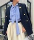 トラッドな金ボタンのジャケットを、ベージュのニットと白のロングスカートで甘めスタイルに。 少し涼しくなってくると、羽織りとしても万能なジャケットがおすすめです。 インナーのニットは薄手で毛玉になりにくいノーリーズの定番ニット。ジャケットを羽織ってもモコモコしません。もちろんご自宅でのお洗濯可能。一枚あると本当に便利です!