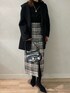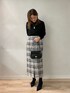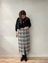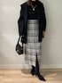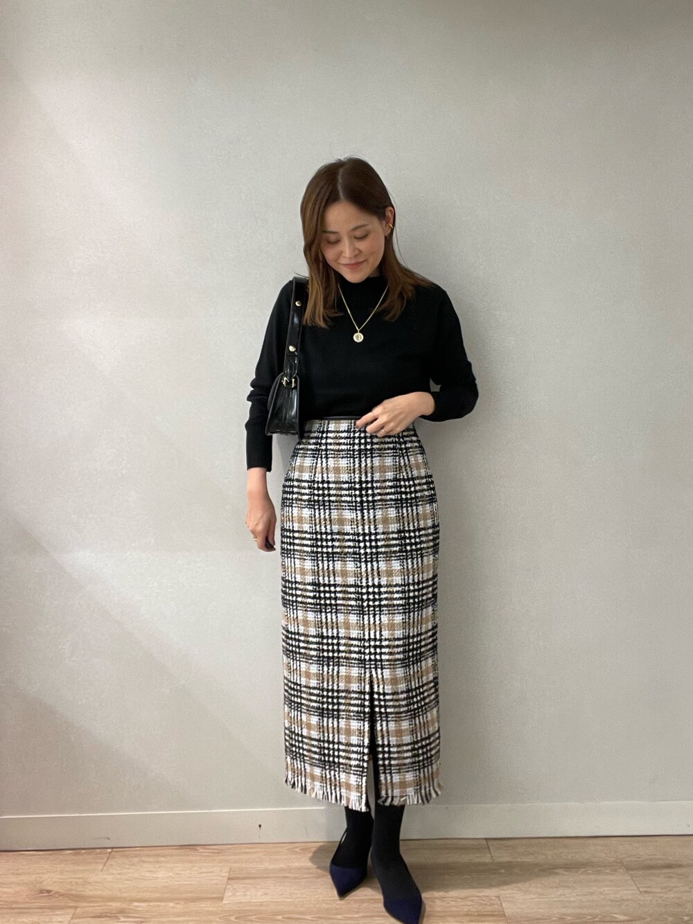 着用サイズ トップス38サイズ ボトムス38サイズ ツィードチェックスカート♡ 冬になると、着たくなるツィード素材 ハイウエストのデザインです ウエストに入ったパイピングはブラックの合皮で インした時にメリハリができて アクセントになります 前スリットもほどよい深さなので ブーツ合わせもいいですし 今回は少し綺麗目見えしたかったので タイツにパンプス合わせにしてみました♡