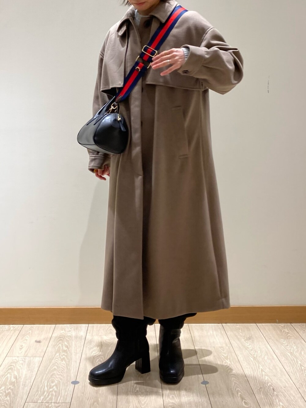 ケープ風のデザインが可愛いロングコート。襟を立てるとスタンドカラーでも楽しめます。しっかりロング丈が素敵な一着です。