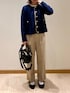トップス→一枚着として着ても可愛いカーディガン。型がしっかりしてるので今時期の羽織としても活躍します。コンパクト丈でスカートとの相性も良いです。 パンツ→34サイズから展開があるので小柄な方におすすめ。両側にアジャストベルトがあるのでウエストもすっきり着られます。