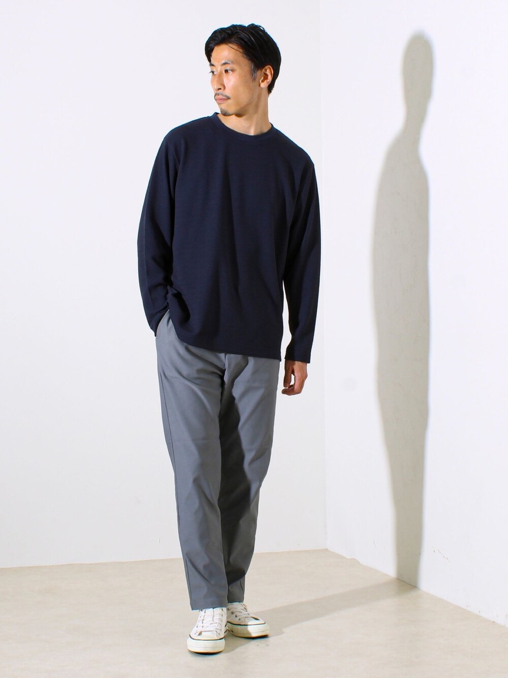 シンプルコーデ。 落ち着いたネイビーのロンTに、ライトグレーのパンツを合わせたシンプルかつ洗練された大人カジュアルスタイル。 オフの日のお出かけやリラックスタイムにぴったりのコーデです。 175センチ 着用サイズLサイズ