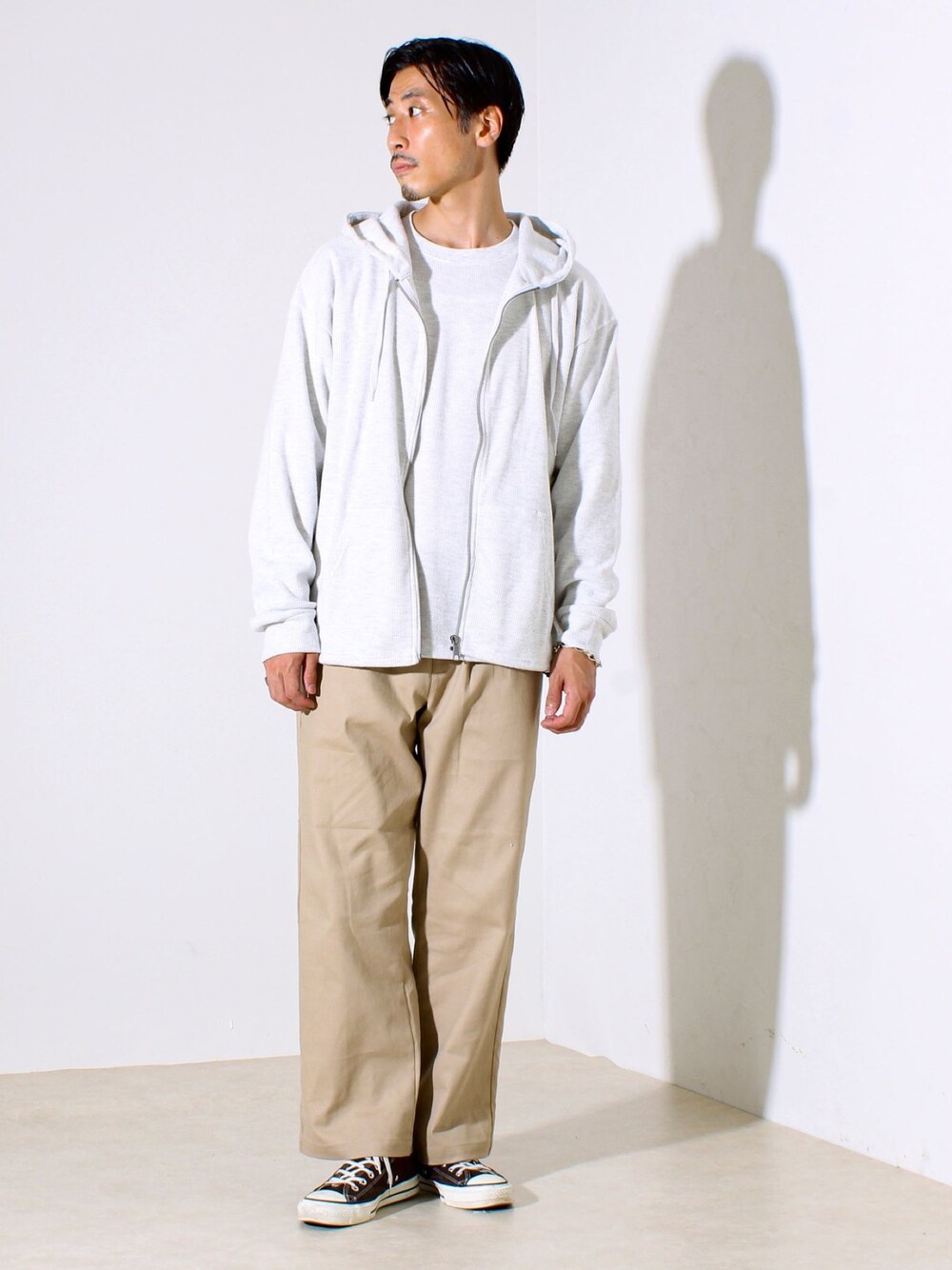柔らかいトーンのシンプルカジュアル。 同素材のパーカーとプルオーバーをアンサンブル風に着用しました。 フェザーグレーとベージュで柔らかい色味でスタイリングしました。 他のアイテムとも合わせやすいモノばかりです。