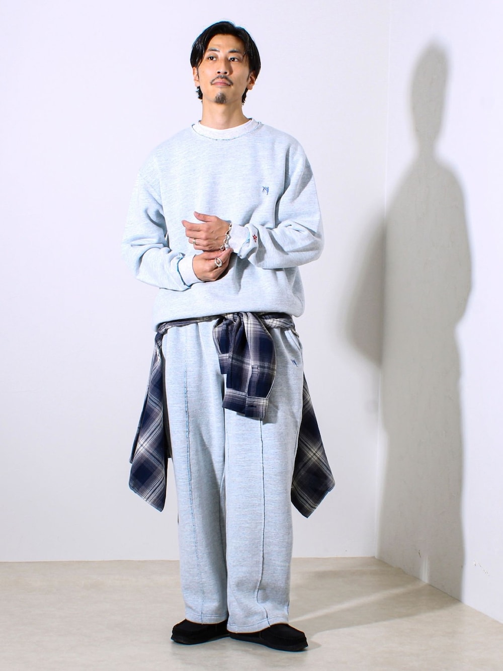 スウェットセットアップスタイル。 裏地がグラデーションカラーの起毛になっているスウェット。 首のリブ回りやパンツのセンタープリーツのところが切りっぱなしのデザインで裏地がチラチラと見えるのもあまり無いデザイン。 チェックシャツで腰巻きして、メリハリをプラスしてます。