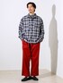 差し色レッドのシャツコーデ。 シャツはステッチが効いてるキャッチーなデザインで一枚で着やすくなってます。 パンツに赤色を持ってきてメリハリとインパクトが効いてるコーデにしました。