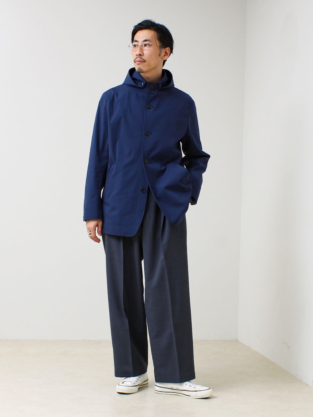 春アウターコーデ。 スタンドカラーとフードが一体になった特徴的なデザインのアウター。 襟の立ち上がりがキレイでスッキリ見えします。 ネイビーのワントーンコーデでシックにスタイリングしました。