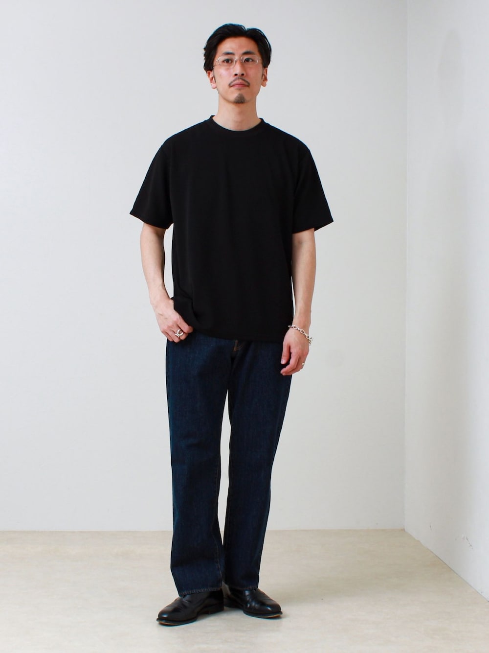 たまにしたくなるシンプルコーデ。 黒Teeにデニムと王道のコーデ。 ただTシャツはコットンのガシガシのTシャツではなく、サラッとしたジャガード入りのTシャツ。 デニムもスッキリ目のストレートなのでキレイで落ち着いた印象になります。