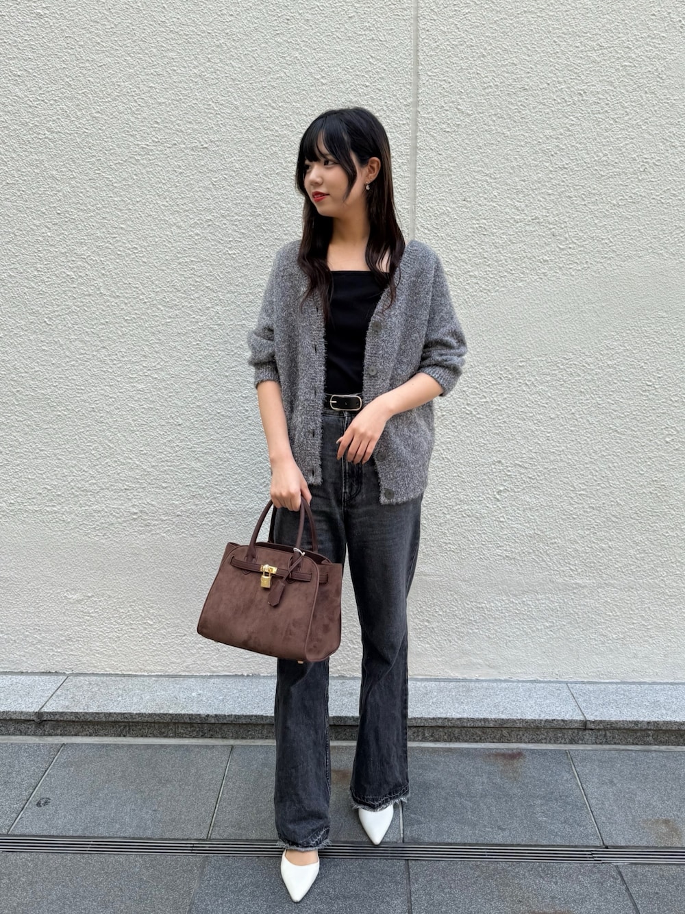 ◾︎カーディガン 程よいラメ感が特徴の着映えカーディガンです! カシミア混のニットで 柔らかい生地感が着心地抜群^^ 5分袖なので今からでも着やすく、 2WAY仕様になっているので カーディガンとしてはもちろん、 プルオーバーとして着るのもオススメです! 合わせるボトムによっても雰囲気が変わるので、 カジュアルからキレイめコーデまで幅広く取り入れやすいです! デニムと合わせて大人カジュアルコーデオススメです♪ ◾︎パンツ 着用サイズ : S ハイウエストのデニムパンツです! 裾にかけてフレアになっており、 ラインもきれいなので、スタイルアップして見えます! 裾の切りっぱなしデザインが シンプルなコーデにもアクセントに! 柔らかい生地感のデニムで、 履き心地も抜群です^^