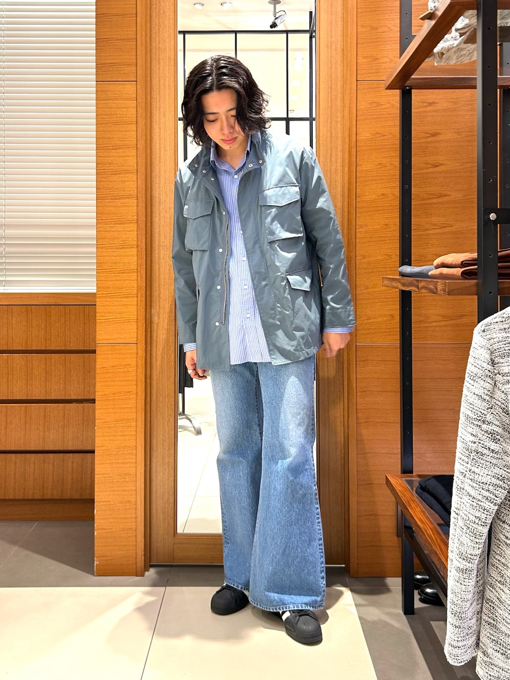 goodman 26SSのM65タイプブルゾンを使用したブルートーンコーデ 小松マテーレのオリジナル加工素材『ダントツ撥水』を使用しており、高い耐久性と撥水性を両立 定番アウターをキレイめにアップデート パッカブル仕様のミリタリージャケット アメリカ軍M-65フィールドジャケットを ミニマルなデザインで踏襲 襟には簡易フードが収納されています このブルゾンの青は少しグレイッシュでスタイリッシュで かっこいいっしゅ笑 他カラーはベージュ、ネイビーがありますが、個人的には このグレイッシュブルーがイチオシ トーマスメイソンのストライプシャツと合わせてみたら すごくいい感じにハマりました デニムもブルーを選んで統一感を出す 春らしい爽やかコーデになったんじゃないでしょうか ・outer 【ダントツ撥水】M65タイプフードブルゾン 26SS #6-0086-1-54-201 ・shirt 《45th Limited Edition》 【THOMAS MASON】レギュラーシャツ 26SS #6-0086-1-51-201