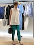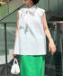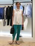 2WAYリボンティアードブラウス Aラインに広がるティアードシルエット、共布取り外しリボン付き、バックスタイルに大きめパール釦など 色々な着方が楽しめるデザイン。 ノースリーブの肩幅が太めなので一枚でも安心感があります。 着丈も長めでパンツやタイトスカートに合わせるのがおすすめです。 着用はホワイトに人気のイージースリムパンツ新色グリーンを合わせています。共布のリボンは蝶結びにせず長くたらしてシンプルな感じにして見ました。パンツのキリッとしたグリーンとバックのブラックで甘さをおさえています。
