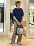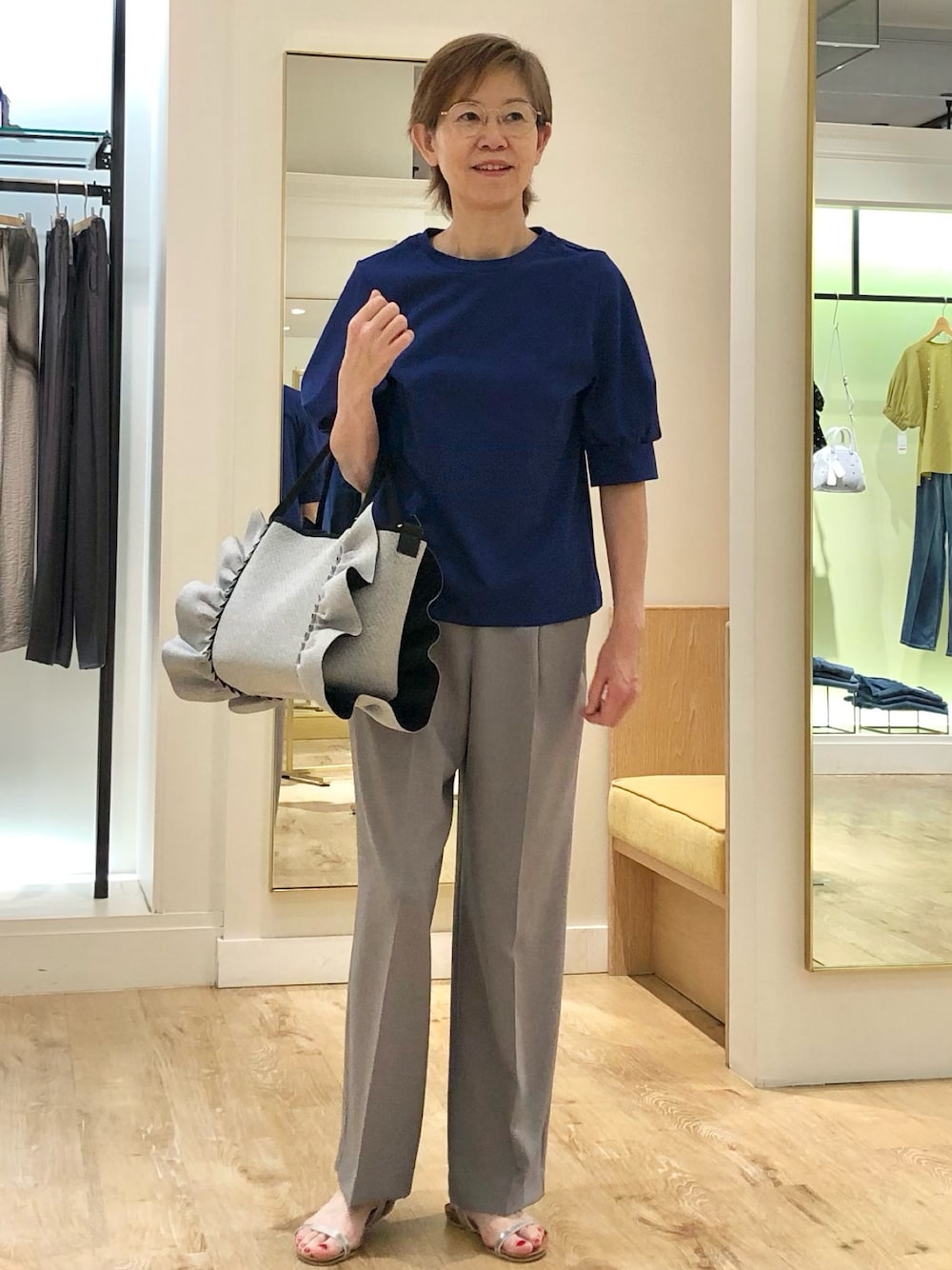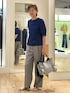 BASICシリーズ5分袖Tシャツ 素材にこだわったBASICシリーズ、 光沢やハリのあるコットン100%で 適度な肉感がある身体のラインを拾わないタイプです。 控えめなパフスリーブでカジュアルからきれい目まで幅広く使えるデザインです。 着用は、はっきりしたブルーにライトグレーのワイドパンツを合わせたきれい目カジュアルコーデ、ウエストインせずラフな感じに着ています。足元にシルバーのサンダルと大きめなフリルがついたグレーのトートバックをアクセントにしています。