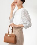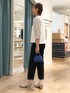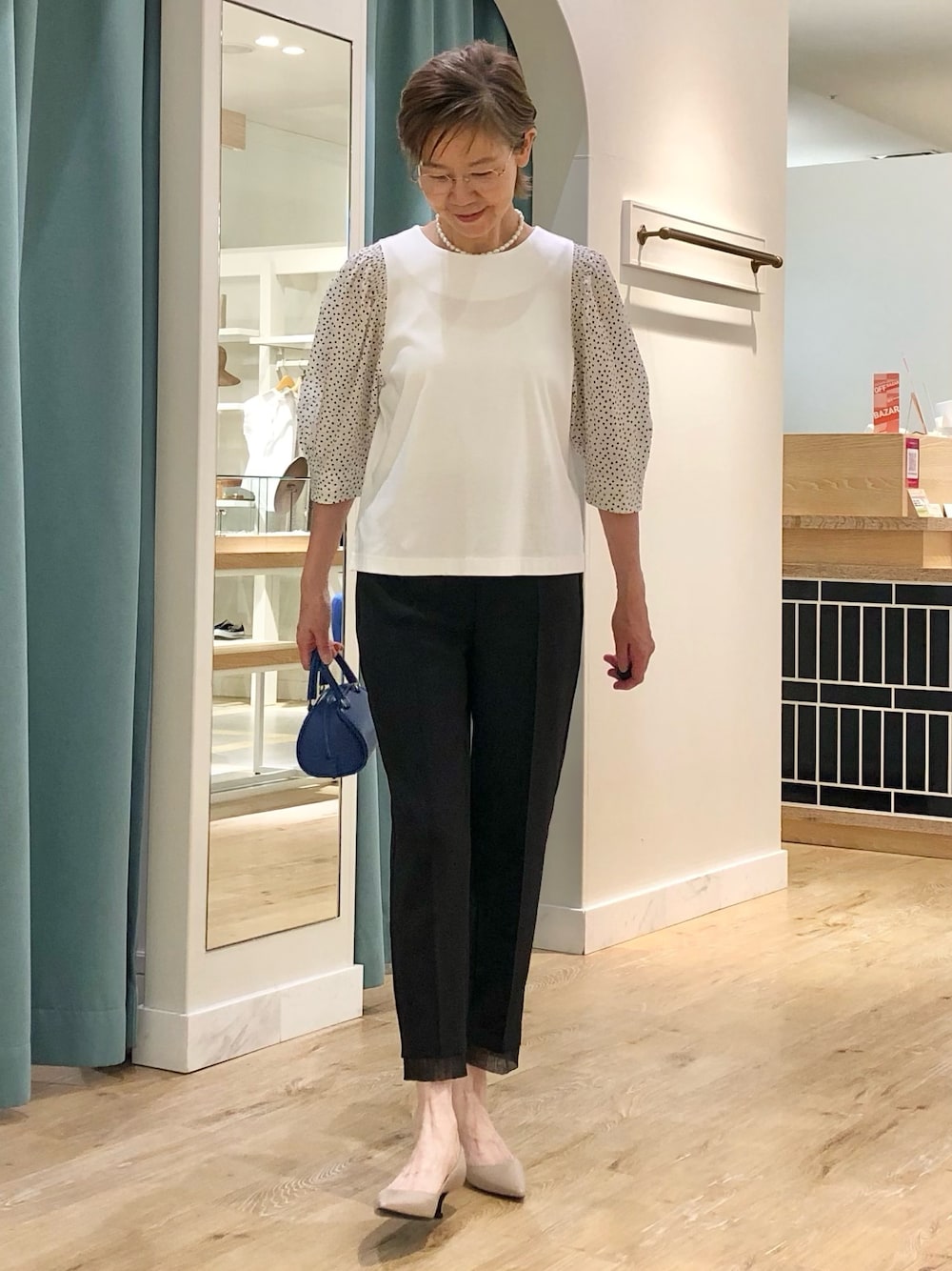 きれい目モノトーンコーデ 袖布帛プルオーバー →しっかりしたカットソーの身頃に柔らかい生地のふんわり袖がついたドッキングデザイン。 共にコットン100%でお手入れしやすい素材です。 ノーリーズらしいきちんと感のあるデザインでお出かけやお仕事にも使えるタイプです。 着用は袖がドット柄×ホワイト、裾にオーガンジーがついているブラックのスリムパンツで合わせたモノトーンコーデ。パンツはやわらかいポリエステル素材でウエストゴムの楽な仕様です。 前のセンタープレスにステッチが入っていて線が消えないように作られているのが助かるデザインです。