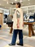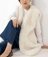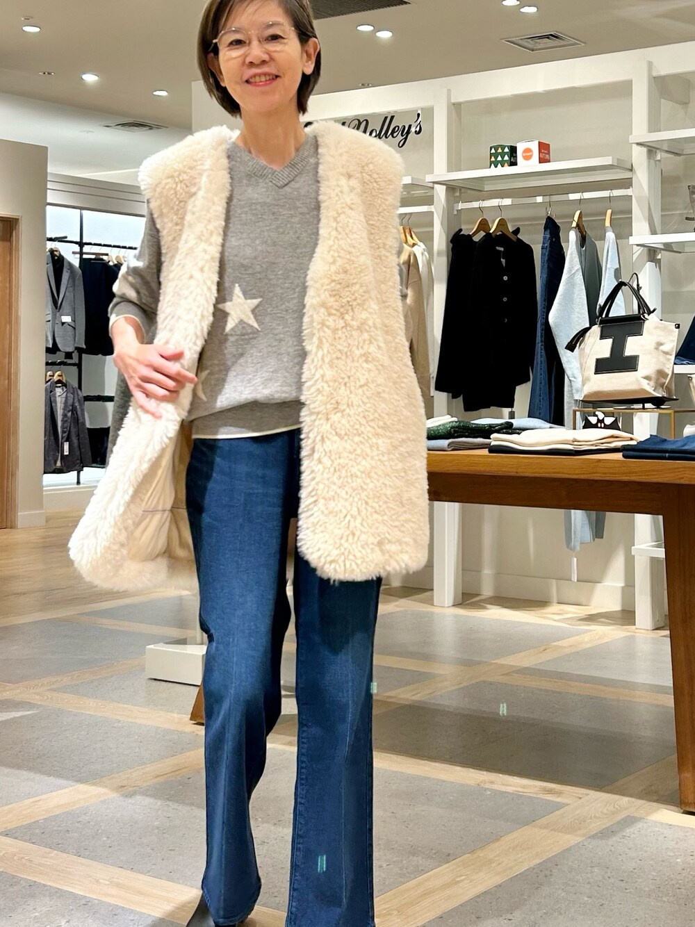 エコファーミドル丈ジレ ボリュームたっぷりのエコファーを使った少し長めのジレ、羽織るだけで華やかになります。 アームがゆったりしているので厚手ニットや薄いコートの上に重ねるのもおすすめです。 着用は同じリエミラー星柄ニットとRMデニム.センタープレスフレアタイプの上にジレを重ねています。 ジレにボリュームがあるのでなるべくシンプルにスッキリした組み合わせにしました。