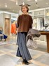 ウールカシミヤボートネックニット 上質な肌さわりのカシミヤ混ウール素材、ボートネックのデザインが女性らしい雰囲気になり顔まわりもスッキリ見えします。 程よいゆとりのサイズ感で一枚でもきれいですが重ね着も楽しめます。 着用はブラウン×ブラックのマキシ丈スカートで大人カジュアルコーデ、ゴールドの華奢なネックレスを重ね付けしてボートネックから見えるデコルテを強調しています。ニットは赤味のブラウンがきれいなので重ね着せずシンプルに着ています。