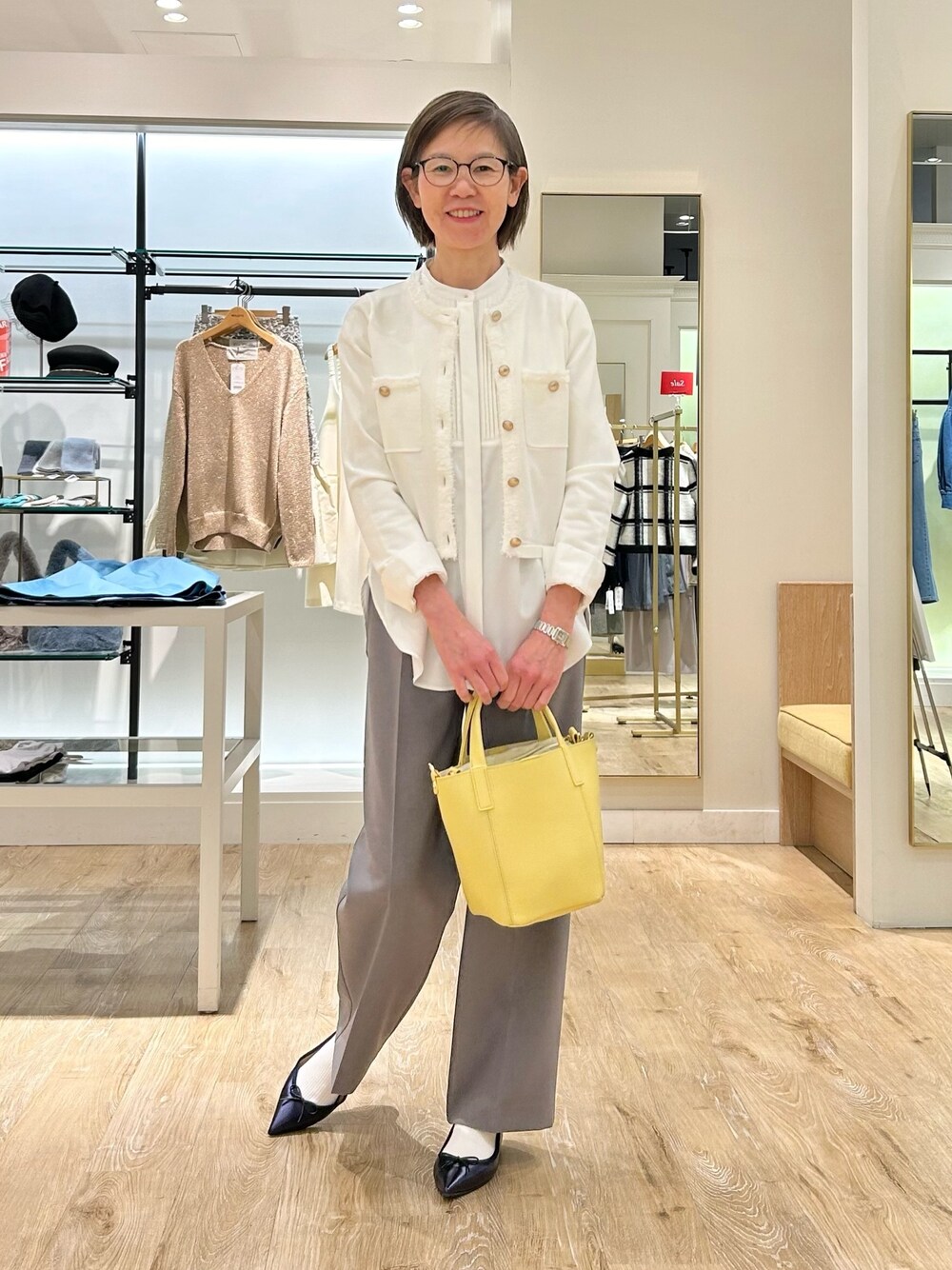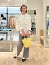 フワシャギークルーネックニットジャケット ジャケット見えするカーディガン 前立てやポケットにフワフワ素材のフリンジが付いていて華やかな印象になります ツヤ消しのメタル釦もアクセかわりに目立つポイントです。 着用はホワイトで中にサテン素材のブラウスを着て レイヤードスタイルにしています グレーのパンツはセミワイドのスッキリしたシルエットで動きやすくカッチリしすぎないきれい目コーデです。 白ソックスにバレエシューズ、カラーバックを合わせてカジュアル感をプラスしていますが 小物を変えたらお仕事用にもおすすめです。