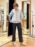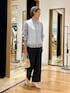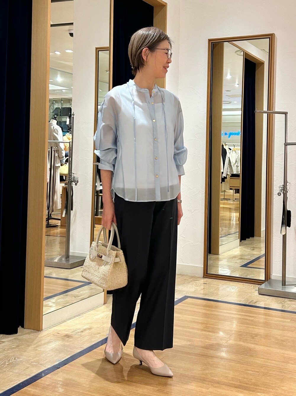 シアーシャツきれい目コーデ 程よい透け感がちょうど良いきれい目ブラウス、 シンプルなデザインに袖口のゴムや細いリボンをプラスしてアレンジされています パンツは麻混ストレッチ素材のセミワイドパンツ、 ストレートに近いシルエットで美脚効果あり ブラウスをウエストインせずゆったりシンプルコーデにしています(ブラウスの着丈が長すぎず、パンツの腰まわりがスッキリしているのでバランスよく着れます)