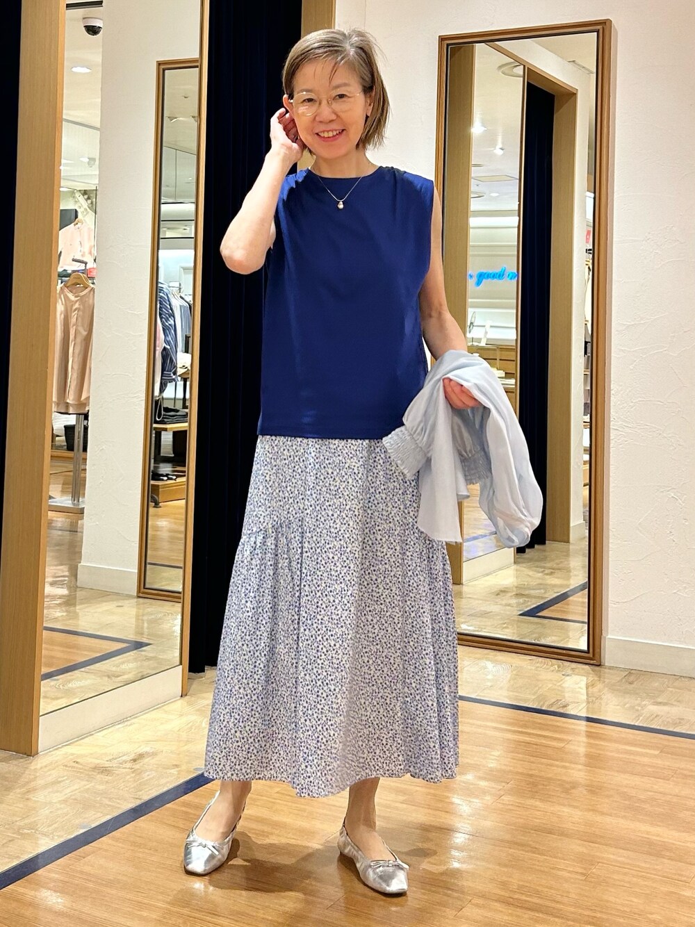 やわらかコットンノースリーブTシャツ コットン100%素材は肌に気持ちよく、柔らかくて伸びのある生地もストレスなく着用できる嬉しいポイントです 肩にタックが入って腕の付け根をカバーしたり腰で自然に止まるしぼりなど、さりげないデザインが入っています 着用は落ち着いたブルーに小花プリントが可愛いフレアースカートを合わせたシンプルコーデ、 トップスをウエストインせずリラックス感を出して 甘さもおさえています