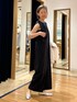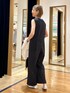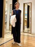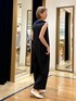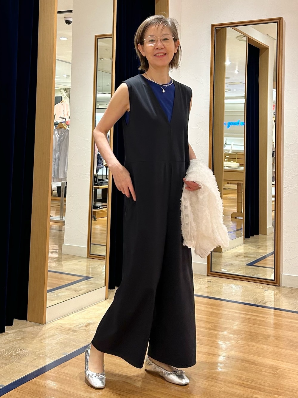 "アクティブシリーズ"オールインワンコーデ 着用するとツルッとして冷んやりの肌さわり、 生地がとっても伸びるのでファスナーなしで 足から入れてヒップや肩もスムーズに通ります 本来は後ろがVあきになるデザインを 前後反対に着ています サイドのポケット方向が後ろ向きになりますが 着心地は問題なしです 前にインナーの色を出したりVあきでスッキリきれるのでぜひお試しください インナーは柔らかくて光沢もあるコットン100%素材、肩のタックや着丈の長さ、腰におさまる少し絞っている裾まわりなど、シンプルな中にこだわりのデザインがつまっています ブラックのオールインワンに濃いめブルーのノースリーブTシャツを中に着ています 腕をスッキリ出すかわりに首もとは詰めたバランスで肌の露出を減らしています
