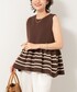 フレア部分のボーダー柄が印象的なデザイン、ミラノリブ編みで厚みがありシルエットがきれいに出ています 肩まわりをコンパクトにして裾のボリュームとバランスをとっています(身幅はゆったりめです) 合わせているパンツは新型の裾フレアタイプ、こちらもしっかりした生地でラインがキープできます ウエストのインゴム仕様でお腹がスッキリ見えて 着やせ効果ありです ブラウン×ブラックで全体に甘さをおさえた色合わせ、ゴールドのネックレスはトップのモチーフがポイントになり胸上の長さが合わせやすくてとでもおすすめです
