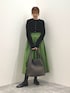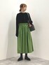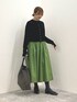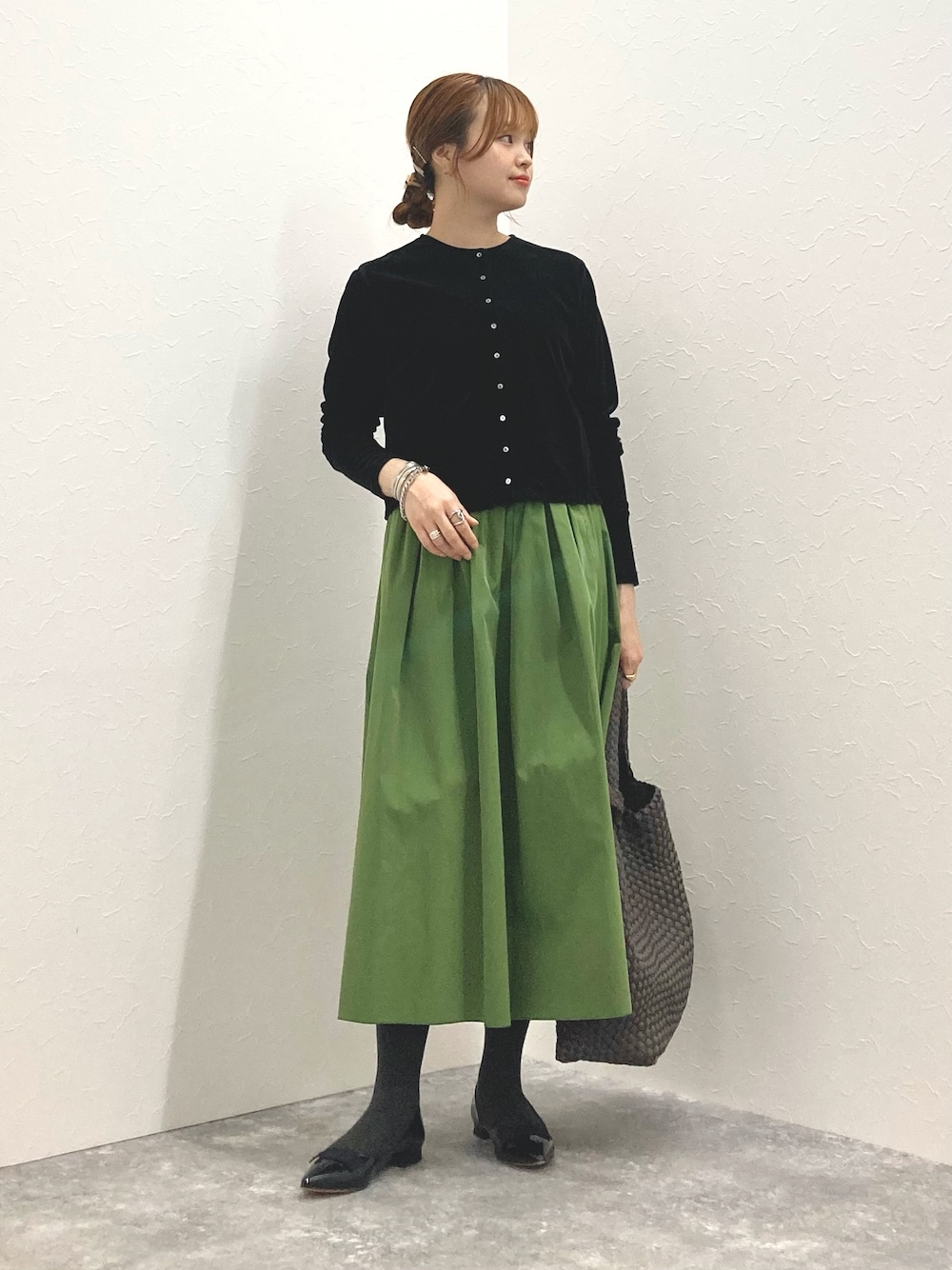 〇カーディガン(Fサイズ) 滑らかで柔らかなベロアの質感が シーズンムードを高めてくれるカーディガン。 ボタンを全て留めて一枚着として◎ コンパクトな着丈でウエストインしなくても バランスよく合わせれます。 程良いゆとりはあるのでさらっと羽織れます。 〇スカート(1サイズ) 適度なハリ感で綺麗なシルエットをキープしてくれ、 程よい光沢感が上品なタフタ素材のスカート。 ウエストは内側のゴムとボタンでサイズ調節ができます。 シワになりにくく長いシーズン着用可能、 さらにリバーシブルでカラーを変えられる万能スカートです。